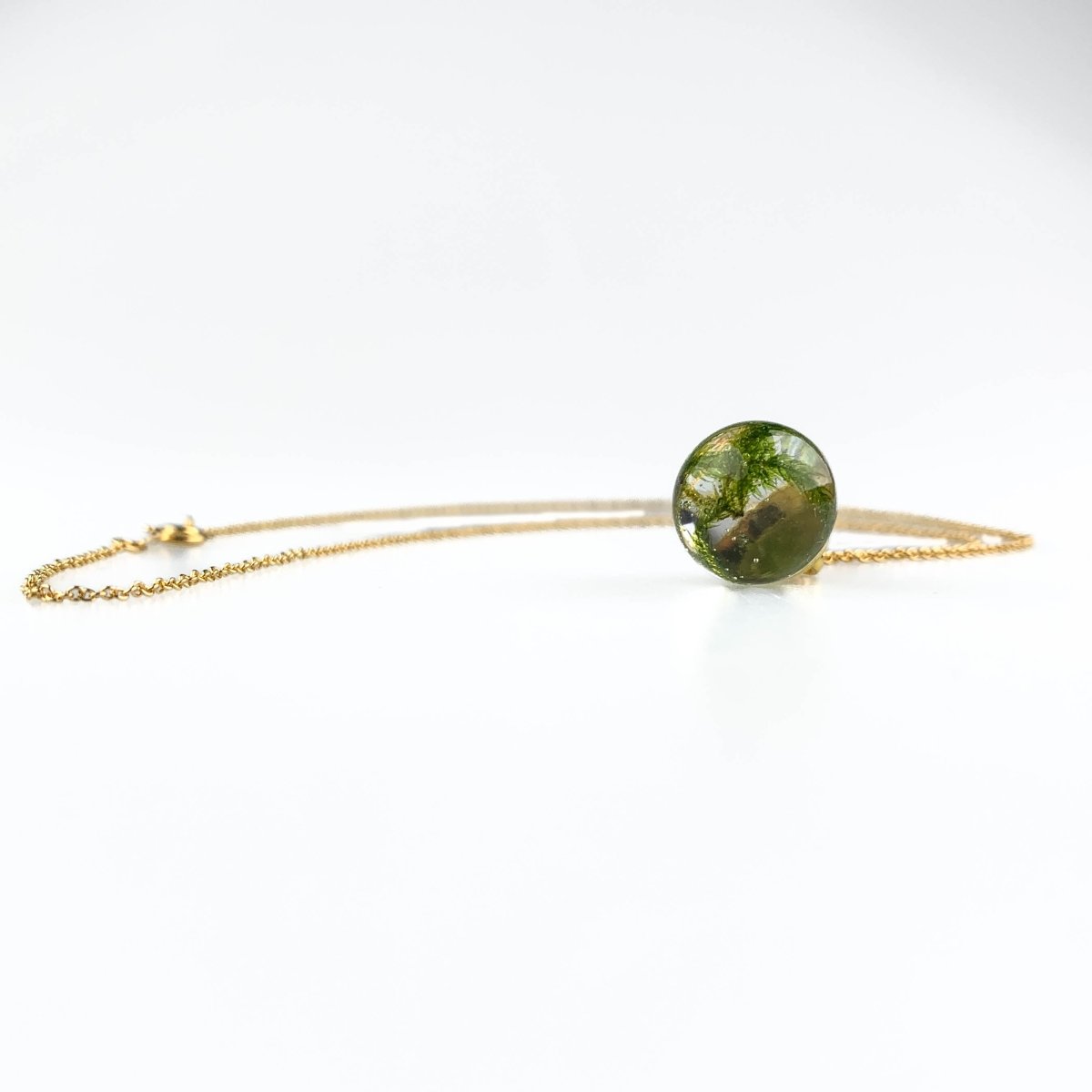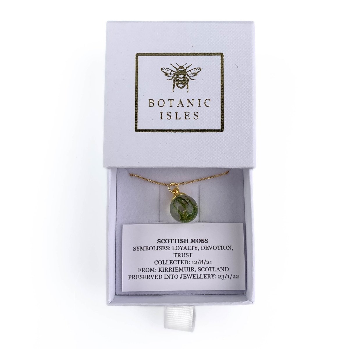 Let yourself be enchanted by the simplicity and beauty of nature with our Necklace Moss Golf Fill, a tribute to the rich Scottish tradition and craftsmanship. This unique necklace, filled with authentic moss from Kirriemuir, Angus, brings a touch of the pristine Scottish forests to your lifestyle.
